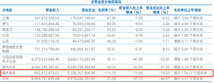 从地区营收来看,海通证券国内各地区营收均同比出现下滑,而境外业务则出现较大亏损,境外业务上半年营收为8.63亿元,而支出为23.38亿元,毛利率达到-171.10%。