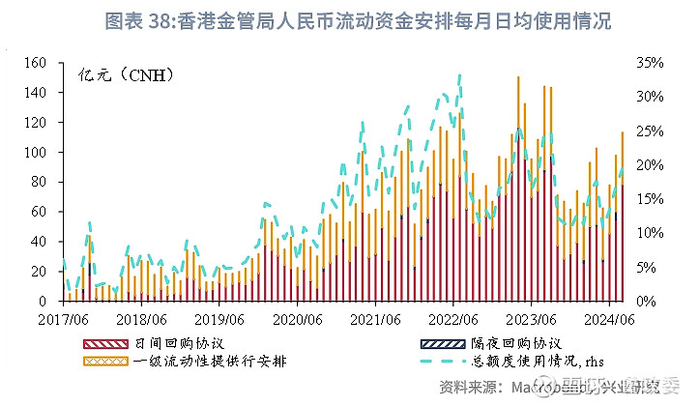 随着市场对美联储9月降息预期升温,港元资金面持续转松。截至8月末,隔夜、1个月、3个月港元HIBOR分别收报3.42%、3.93%、4.20%,较上月末分别变动-83.2bp、-50.6bp、-34.1bp,其中3个月港元HIBOR创2023年5月以来新低。8月银行体系短期流动性充裕、未涉及香港金管局贴现窗拆借活动。此外,1个月、3个月港元掉期下行亦反映了港元资金面宽松预期。