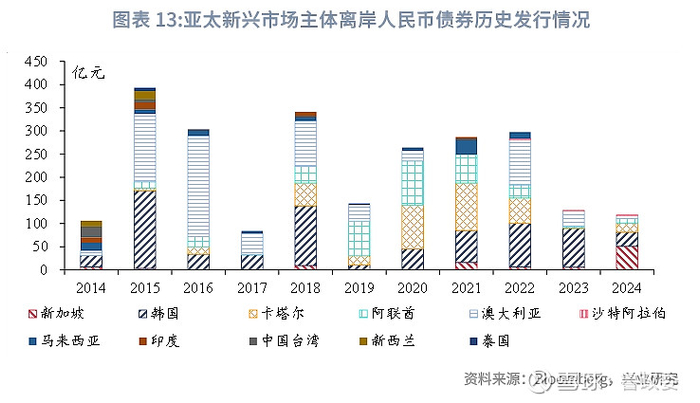 今年以来亚太新兴市场主体离岸人民币债券发行延续活跃。1-8月,除中国内地、中国香港及日本的亚太新兴市场发行人离岸人民币债券发行规模约为118亿元、超过2023年总体发行规模的90%。按发行人所在市场看,2014年以来,澳大利亚、新西兰及印度离岸人民币债券发行规模整体减少,而中东及韩国发行人占比逐渐上升。