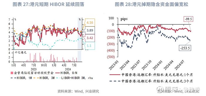 股市:8月港股一级市场活动步入淡季;二级市场逐步消化恐慌情绪,恒生指数8月连续4周上涨。短期市场聚焦港股资金面、美联储降息落地料带来配置机会;中长期来看,基本面偏缓复苏下港股震荡行情尚未扭转。通过对比近月港股及A股回调表现及行业结构,我们判断在海外流动性边际改善期间,港股或较A股更具弹性。外汇:8月港元资金面持续转松;而在银行体系港元供给受限背景下、资金面宽松反映出本地信贷需求仍然承压。从香港银行体系贷款规模及分行业需求来看,美联储年内降息落地有望缓解信贷需求压力;但香港地产价格走低、住房按揭贷款利率短期仍然高企,预计地产相关信贷或需更长时间修复。8月境内外人民币掉期价差、境内外人民币利差均明显收敛,人民币升值弹性修复;短期内人民币即期料延续偏强震荡,重点关注9月美联储本轮首次降息幅度。