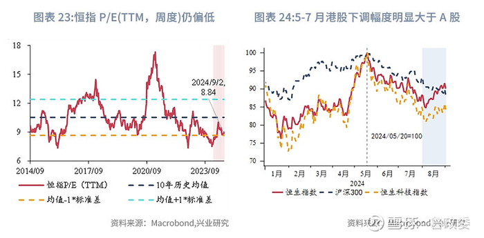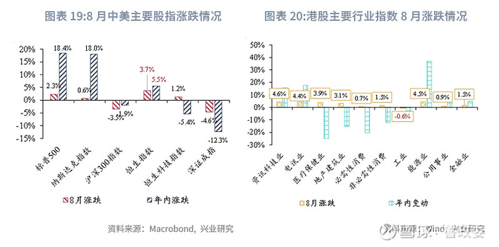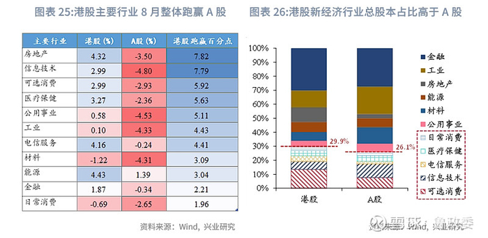 对比来看,流动性边际改善期间,港股或较A股更具弹性。5月下旬以来,在内地经济数据维持偏弱复苏的背景下,港股的下跌更加充分地计入悲观因素,当前恒指估值持续徘徊于历史15%分位以下,AH股溢价则在147左右的近年高位徘徊、令港股持续具备投资性价比。从行业表现来看,8月以来港股消费、信息技术等主要新经济行业明显跑赢A股,这类行业对海外流动性修复更加敏感、且在港股市值中占据更大比重,后续上涨的弹性预计更大。