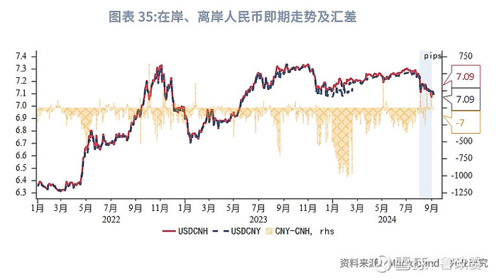 8月离岸人民币即期汇率基本收复今年所有跌幅、在-离岸即期汇率倒挂明显收敛。月内外汇交易先后受到日元carry trade平仓和美国降息预期的影响,8月初离岸市场美元兑离岸人民币空头出现加仓、CNH快速升值到7.10附近;月内人民币中间价与收盘价并轨,随后进入偏强震荡。8月末USDCNH收于7.0707、月内离岸人民币累计走强2.6%(7月累计走强1%);在-离岸人民币即期汇差8月围绕-86.4pips的中枢波动,较7月中枢-161pips明显收窄。