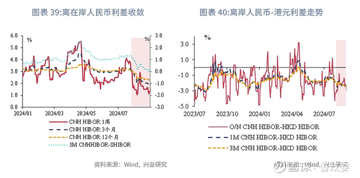 8月CNH流动性进一步释放、离-在人民币利差明显收敛。月内离岸人民币利率整体波动下行,点心债发行认购活动阶段性支持CNH资金需求。月内,1周、1个月和1年期CNH HIBOR分别围绕1.64%、1.96%、2.47%的中枢波动,分别较前月明显下行154.3bp、119.bp、64.6bp。8月香港金管局人民币流动资金安排日均使用额度共计113.2亿元(每日总额度580亿元),环比增加15.8%。境内方面,8月人民银行公开市场净投放4170亿元,境内SHIBOR先回落后反弹;境内-境外人民币利差显著收敛。