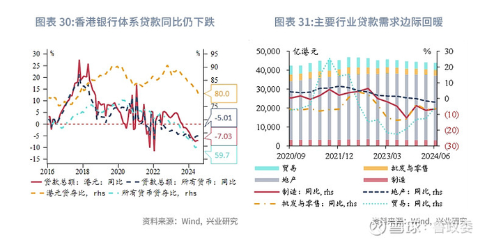 从贷款规模看,香港银行体系贷款总规模自2022年5月以来同比维持下跌、港元贷款规模同比连跌11个月;港元贷存比自2022年10月高位连续回落。从行业分布看,根据金管局统计,在香港使用的银行贷款中有近80%与地产相关(包括地产开发与投资、按揭贷款等),相关贷款规模自2023年第四季度以来连续3个季度同比下跌。而自2023年下半年以来,随着外需回暖、美联储加息周期步入尾声,主要行业贷款规模跌幅边际收窄。后续看,美联储年内降息落地有望提振本地信贷需求,但香港地产价格走低、住房按揭贷款利率短期高企背景下,地产相关信贷或需更长时间修复。