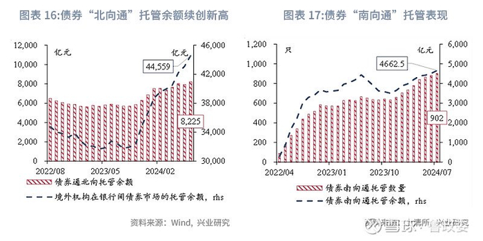 债券“南向通”托管余额续创历史新高。根据上清所数据,截至2024年7月末,通过互联互通模式托管“南向通”债券托管余额为4662.5亿元、环比增加2.2%,再度刷新历史高位;相关债券占上清所托管债券总余额的比重为1.16%。