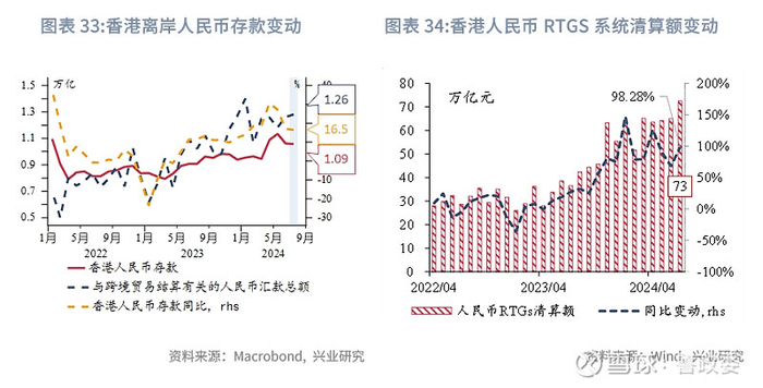 7月离岸人民币存款规模环比小幅回落、跨境贸易相关交易连续2个月环比增加。截至7月底,香港人民币存款总额为10575亿元(人民币,本节下同),环比回落0.4%,同比增长约17%。7月与跨境贸易结算有关的人民币汇款总额环比增加1.6%至12815亿元、续创历史次高位(最高为2024年1月的1.4万亿元),同比升25.4%。7月香港人民币RTGS系统[2]清算额为73万亿元,同比、环比分别增长90.1%、1.3%。