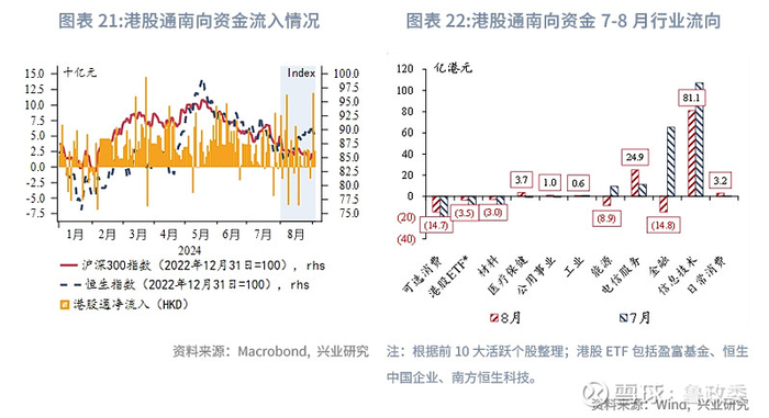 海外降息预期支持港股风险偏好回暖。7月末至8月初,日元套息交易平仓以及海外市场衰退预期升温,引发港股短期震荡,恒生指数一度触及4月下旬以来的新低。随后,月内公布的美国GDP增长等一系列经济数据再度印证“软着陆”预期,消费及就业仍具韧性;海外市场月内后半段逐步消化恐慌情绪、回归降息交易。恒生指数8月连续4周上涨、月末收于17989.1点,月内累计上涨3.7%,恒生科技指数累升1.2%。从成交来看,8月港股主板日均成交额环比延续收缩至955.1亿港元,但环比跌幅由11.4%收窄至3.1%,月末以来成交进一步回升至1000亿港元以上。港股通南向资金8月末以来也进一步转为净流入。从板块来看,8月港股仅恒生工业指数(-0.6%)录得跌幅、其余行业指数均上涨。值得注意的是,按港股通南向资金成交活跃个股来看,8月金融行业由净流入转为净流出、高息银行股8月后半段转为下跌,或受到下调存量房贷利率等市场消息的影响。
