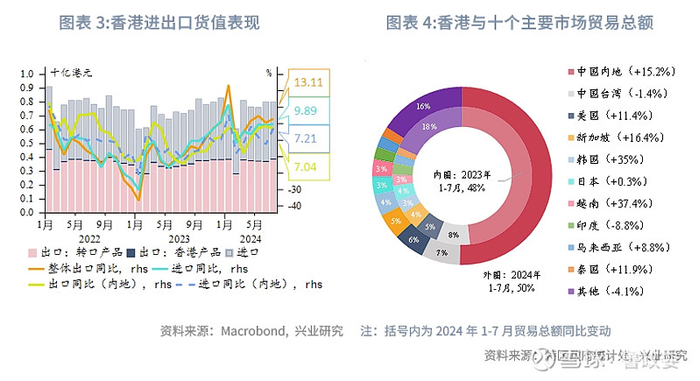 与此同时,香港进出口复苏步伐明显加快,与东盟贸易往来有望延续增长。香港7月整体出口货值同比增长13.1%,进口同比增长9.9%、创今年1月以来最大升幅,进出口货值均同比连升5个月。今年1-7月香港出口累计同比上升12.4%,进口上升8%,按主要市场来看,年内香港与越南、新加坡等东盟国家,以及韩国的贸易总额同比大幅增长。后续看,若外部需求维持稳定,香港出口的正面表现料将延续。