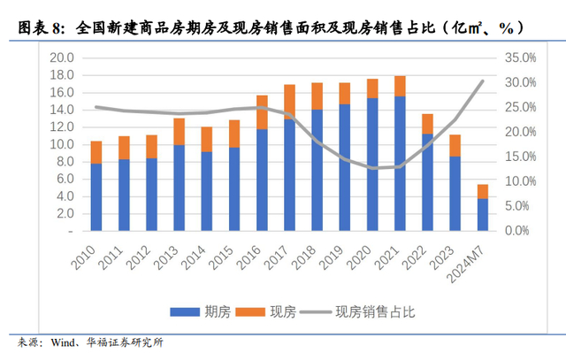 可喜的是,政策宽松下现房销售有所复苏。据华福证券,2023年至今,商品住宅销售分化明显,全国商品房市场中现房销售增速显著优于期房。一方面,现房所见即所得,规避期房交付风险;另一方面,房价预期不明朗环境下,购买期房提前锁定房价风险较高。截至2024年7月,全国商品房销售面积中,现房销售1.6亿平方米,期房销售3.8亿平方米,现房销售占比占全国商品房销售的比例超过30%。
