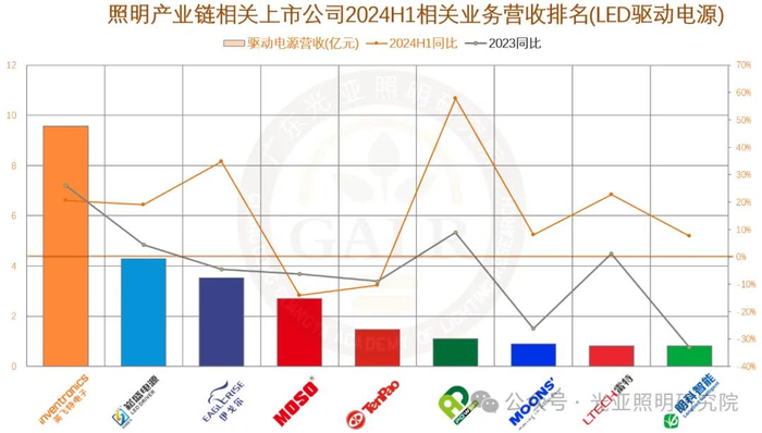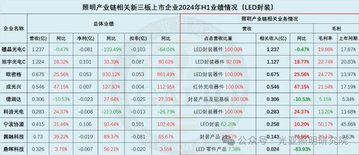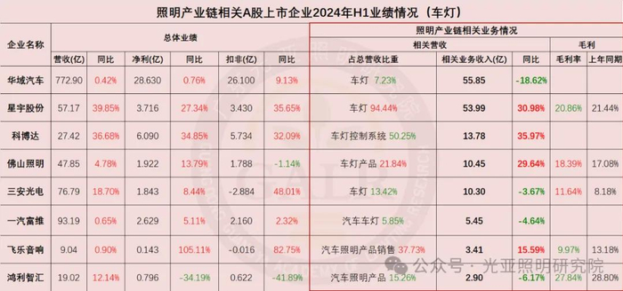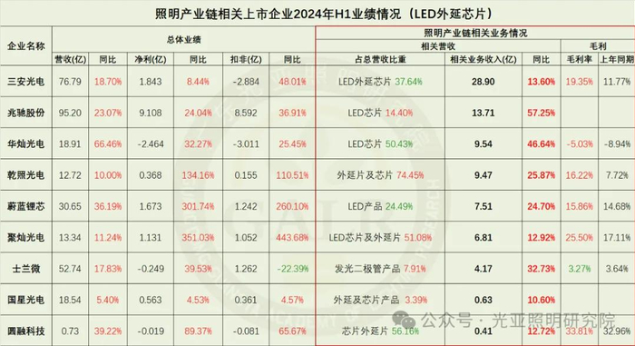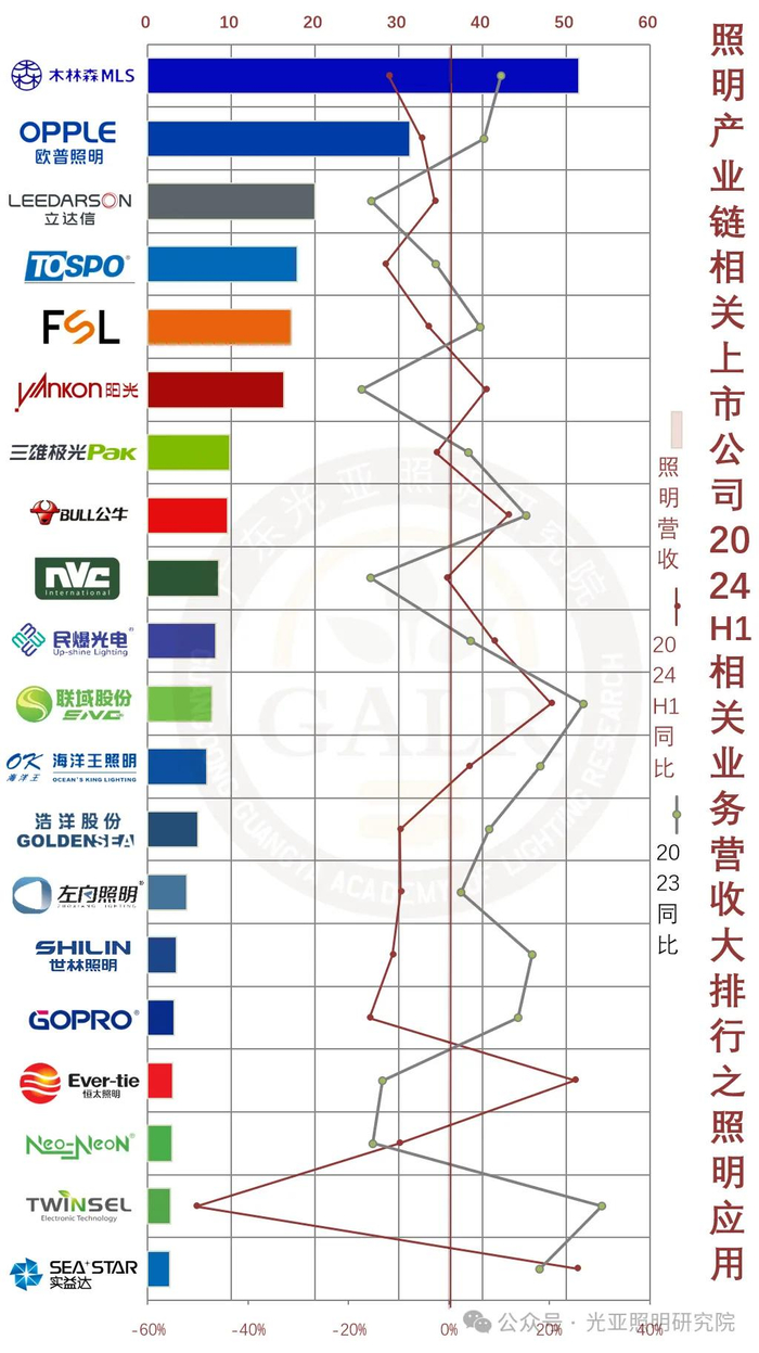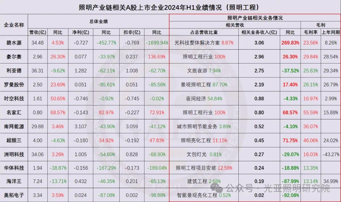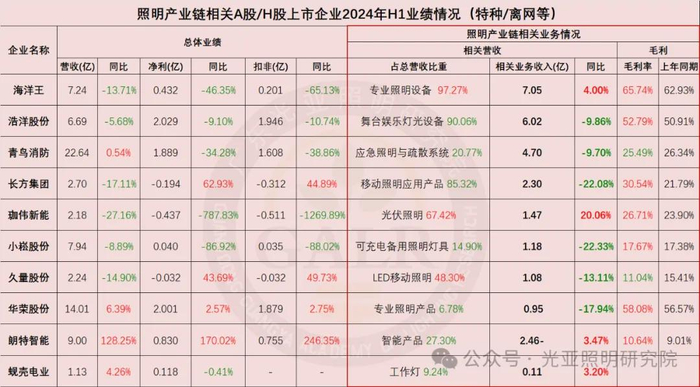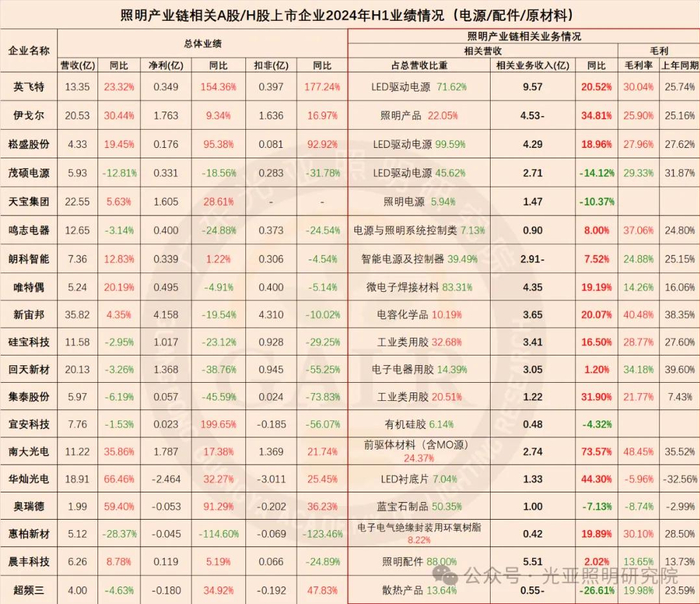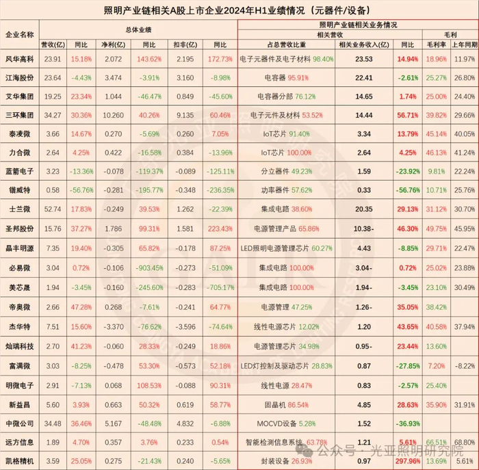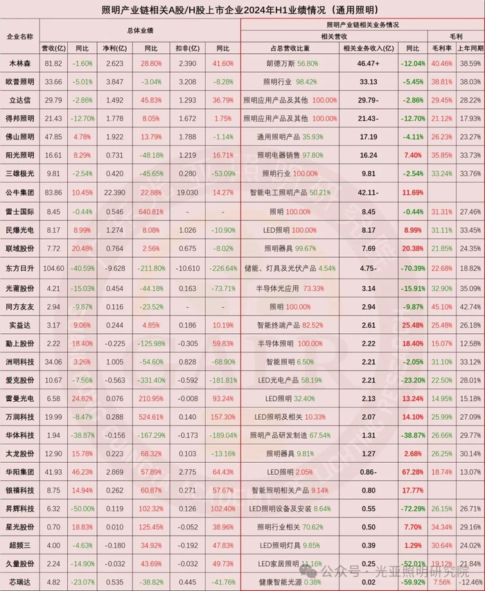 2024年上半年照明产业链相关上市公司整体业绩表现综合如下(部分企业涉及多项业务):