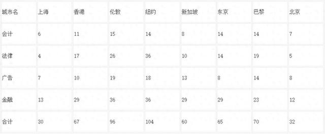 国际权威全球城市排名研究机构(GaWC)根据先进生产性服务业(APS)跨国企业(跨国企业的定义是子公司超过15个)的数量描述其办公网络分布状态,建立服务价值矩阵,并对不同城市的办公地选址作出评级,设立全球总部得5分,作为跨城市的重要功能布局得4分,设立大规模的行政管理办公室得3分,设立业务板块代表处得2分,办公职能较少且没有公司业务的得1分,不设办公室或工作员工等得0分。评级为alpha++的城市包括伦敦和纽约,评级为alpha+的城市为香港、北京、新加坡、上海、巴黎、东京。