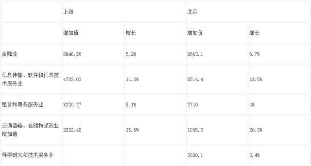 由表3,上海的金融业增加值略高于北京,但增长低于北京1.5个百分点;上海的“租赁和商务服务业、交通运输、仓储和邮政业”增长都高于北京。上海的租赁和商务服务业的增加值增长要高于北京近一倍,说明上海的生产性服务业发展状况较好,但交通运输、仓储和邮政业增加值的增长率要低于北京4.7个百分点。值得关注的是,北京的信息传输、软件和信息技术服务业增加值要高于上海的近一倍,且增长高于上海2.2个百分点,并且,北京在科学研究和技术服务业方面的增加值达3630.1,增长3.4%,但上海统计局尚未有此项统计。