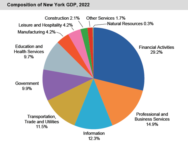 除了与国内北京市、广东省比较,本欲与美国纽约作比较,但由于两个城市的统计分类不一样,但找到了2022年美国纽约市的经济报告,不能作对比,但也可以从纽约市的GDP构成中找到相应的差距。