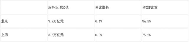 北京在软件与信息技术服务业方面的投入也加大。2023年,北京市服务业实现增加值3.7万亿元,占北京地区生产总值(GDP)的比重为84.8%;按不变价格计算,同比增长6.1%,高于GDP增速0.9个百分点,拉动经济增长5.1个百分点。与上海相比,上海的服务业增加值占GDP比重落后于北京9.6个百分点,差距较为明显,见表2。