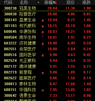 在大盘不振的情况下,9日医药板块逆势走强,10多个与医药生物相关的概念板块全涨。截至收盘,冠昊生物、阳普医疗、盈康生命等走出20%涨停,13只个股涨超9%。盘中,老百姓、海南海药、中源协和、赛隆药业、南华生物、尚荣医疗等10余只个股曾涨停。