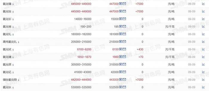今年上半年,稀土价格整体呈现震荡下行的走势。截至6月28日,氧化镨钕价格上半年下跌幅度约为17.97%;中重稀土下跌幅度相对更大,氧化镝价格上半年下跌了27.31%,氧化铽价格上半年下跌了27.7%。9月9日,稀土产业链整体出现继续上涨。其中,SMM氧化镨钕的均价为44.3万元/吨,与前一交易日相比上涨1.61%;氧化镝均价为1860元/千克,与前一交易日相比涨3.91%;氧化铽的均价为6150元/千克,与前一交易日相比上涨7.52%。