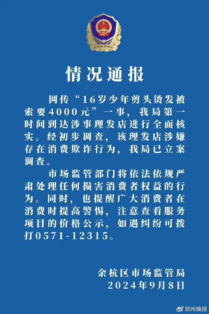 9月8日,浙江杭州余杭区市场监管局通报“16岁少年剪头烫发被索要4000元”:理发店涉嫌消费欺诈,已立案。