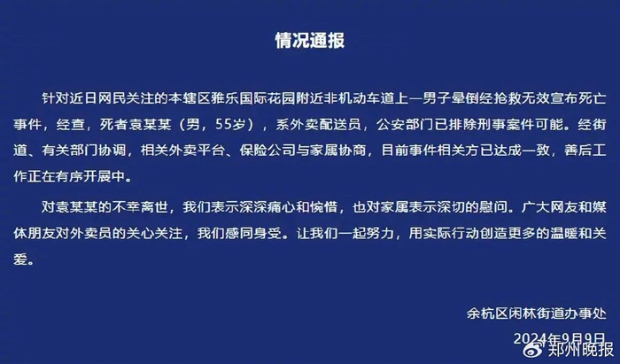 9月9日,官方通报杭州55岁外卖员,晕倒抢救无效死亡,公安部门已排除刑事案件可能。