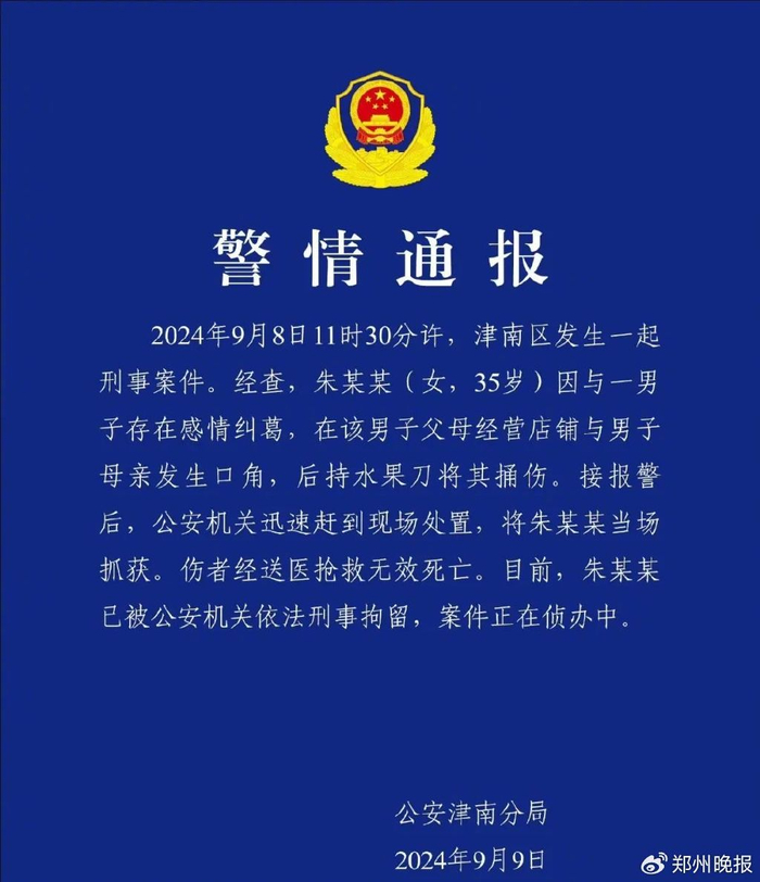 9月9日,天津市公安局津南分局发布通报称,一女子因感情纠葛捅伤一男子母亲,伤者经抢救无效死亡,目前嫌疑人已被抓获。