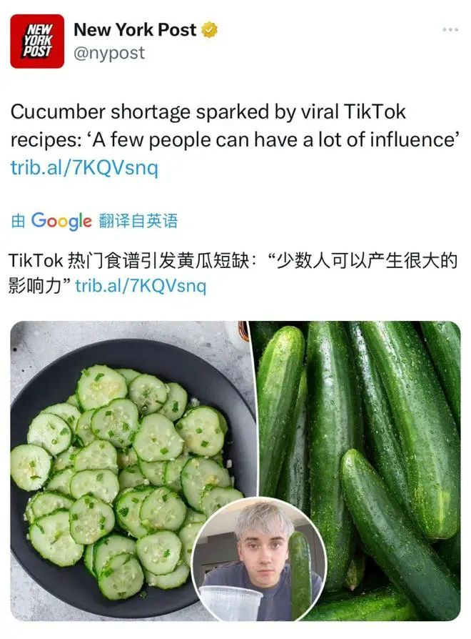 前段时间一位外国博主发布了一则黄瓜的推荐吃法,食谱竟意外走红成洋抖最火食谱。
