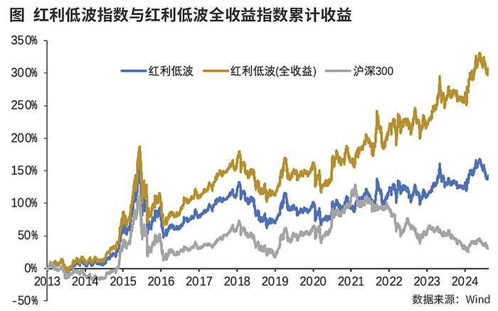 红利策略的收益可以分为分红派息与资本利得,一方面能够在长周期通过企业持续分红获得稳健且确定的安全垫,另一方面也可利用市场的阶段性价值低估,寻求估值修复获利或低估防御属性,从而构筑了红利策略的长期有效性。我们通过拆解中证红利低波指数在2013年至2024年7月31日这十多年间的收益构成,可以看到红利低波指数的累计收益为142.5%,红利低波全收益指数的累计收益为307.2%,这也意味着红利再投资的累计收益达到 164.7%,股息收益远超资本利得,年化股息率可以达到4%以上。