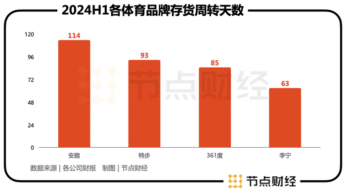 作为对比,《节点财经》计算得出,李宁、361度、特步三家的存货周转天数分别为63天、85天、93天。