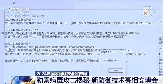 在互动体验区,工作人员通过两台电脑向记者还原了勒索病毒入侵用户电脑的全过程。工作人员点击了一个看似正常的电子邮件里的链接,系统下载解压文件后,刚一点开里面的文档,电脑系统后台就被攻击方接管、植入了病毒,没过多久屏幕上弹出了一条警告信息,提示文件已被加密。