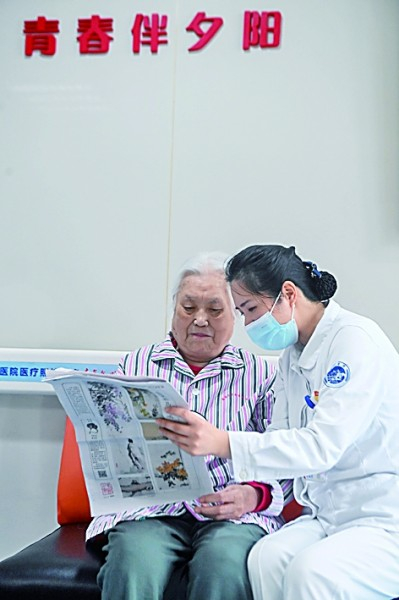 浙江医院医疗照护病房的护士在休息区陪患者读报。