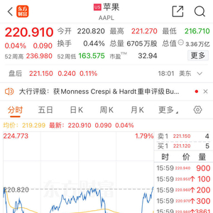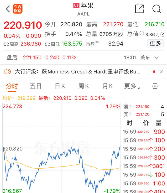 发布会期间,苹果(AAPL,股价:220.910美元,总市值:3.359万亿美元)股价大多继续处于跌势,刚开始曾短线转涨,发布会结束后逐步追随大盘反弹,尾盘抹平跌幅,最终微幅收涨、几乎收平,企稳于上周五回落刷新的8月12日以来收盘低位。