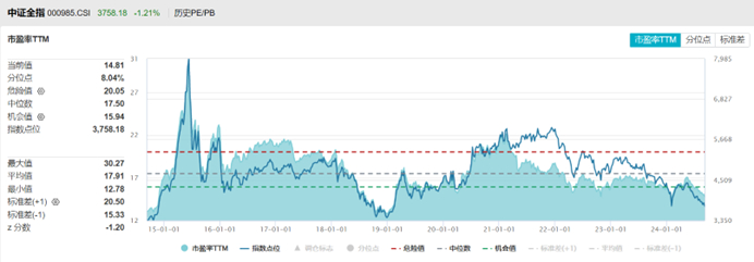 经过两年的调整,A股估值已处于历史相对低位。Wind数据显示,当前,中证全指指数PE(TTM)为14.81,处于历史8.04%分位数。