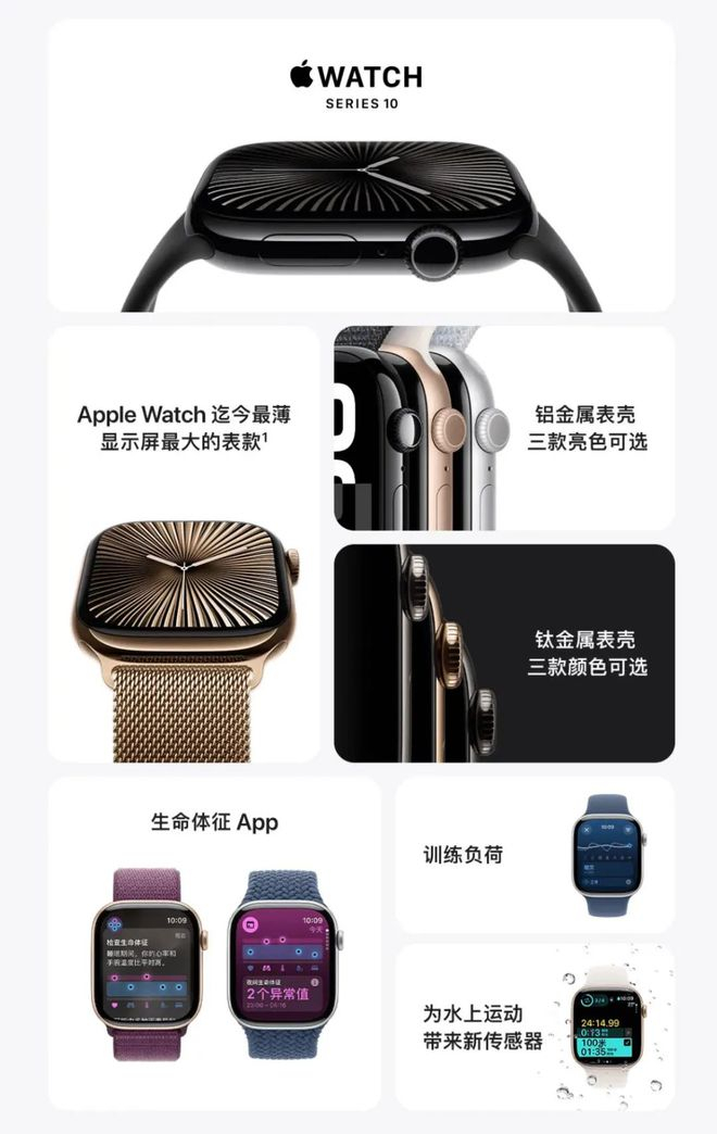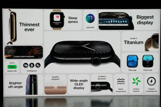 苹果发布的第一款新品是经过重新设计的第十代智能手表Apple Watch Series 10。它是迄今为止最薄的Apple Watch,厚度仅9.7毫米,比前代Series 9薄10%。