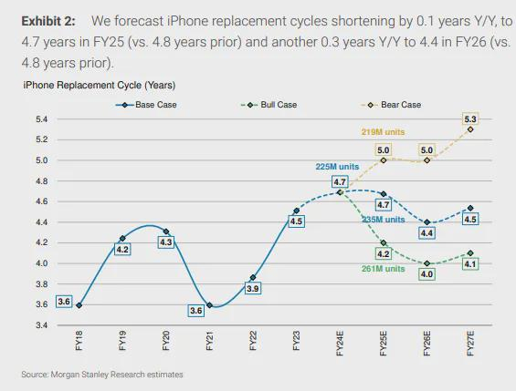 摩根士丹利分析师称,iPhone 16引入Apple Intelligence有助于释放被压抑的需求,并加速iPhone的更换周期,目前换机周期处于历史高位4.8年。同时,这可能将在未来3至12个月内支持苹果追加iPhone生产订单。
