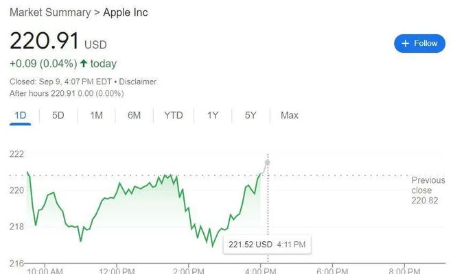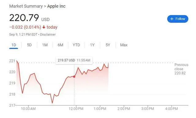发布会期间,苹果股价大多继续处于跌势,刚开始曾短线转涨,发布会结束后逐步追随大盘反弹,尾盘抹平跌幅,最终微幅收涨、几乎收平,企稳于上周五回落刷新的8月12日以来收盘低位。