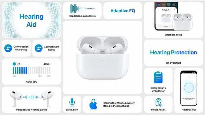 苹果还推出了具有三项新健康功能的第二代AirPods Pro 2。它将在所有聆听模式下默认开启一项名为“听力保护”的新功能,旨在帮助预防和提高人们对听力损失的认识。通过该功能,用户将能进行临床验证的听力测试,使用 AirPods Pro 和 iPhone 只需五分钟即可完成测试,查看他们是否已经存在听力损失。