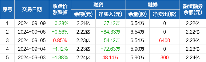 融资方面,当日融资买入54.97万元,融资偿还92.09万元,融资净偿还37.12万元,连续4日净偿还累计248.2万元。融券方面,融券卖出0股,融券偿还0股,融券余量6.54万股,融券余额23.15万元。融资融券余额合计2.22亿元。
