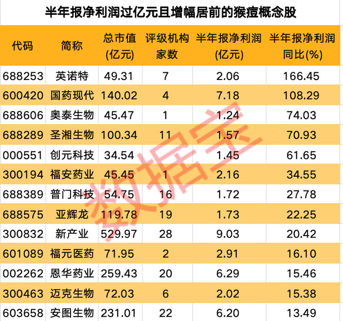证券时报·数据宝梳理了半年报净利润过亿元且同比增幅居前的猴痘概念股,共计13只。从净利润规模来看,新产业国药现代恩华药业安图生物净利润规模超过5亿元,依次为9.03亿元、7.18亿元、6.29亿元、6.2亿元。