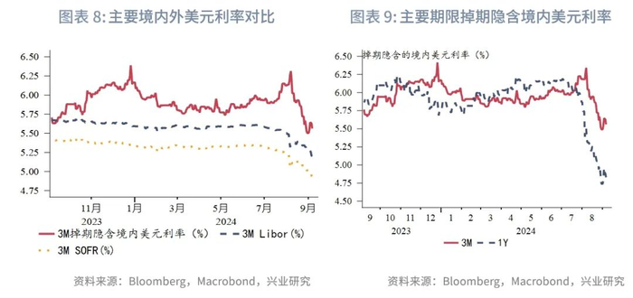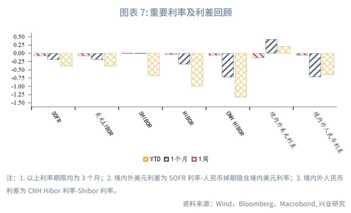 美元流动性方面,3M境内掉期隐含美元利率重新回落,降幅小于SOFR、美元Libor利率,境内外美元利差(境外-境内)收敛。