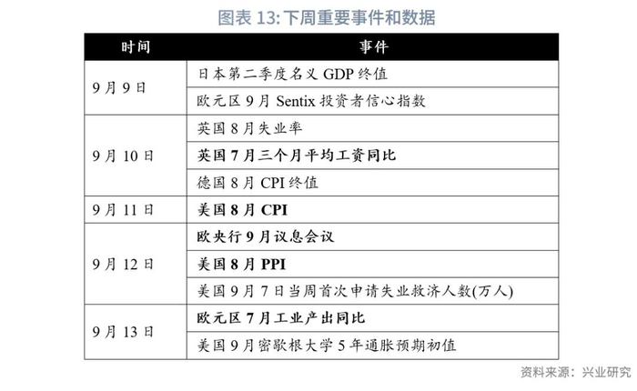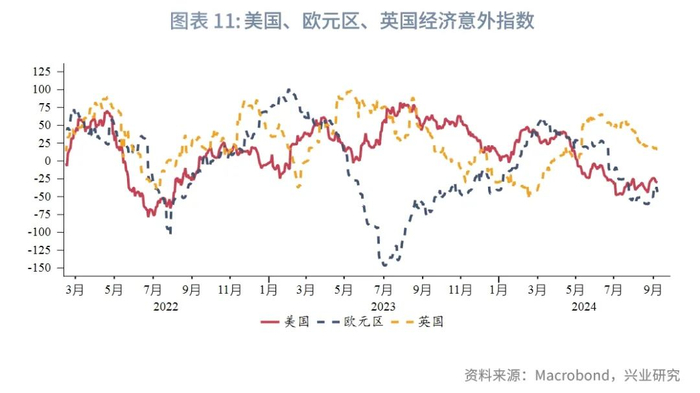 本周公布的欧元区经济数据同样亦好亦坏,经济意外指数企稳。欧元区7月零售销售环比升0.1%,不及预期的0.2%,且前值从-0.3%下修为-0.4%。欧元区和德国8月综合、服务PMI终值较初值均有所下调。欧元区8月综合PMI终值51,初值为51.2。欧元区第二季度GDP季环比终值为0.2%,低于预期的0.3%。德国7月工业产出环比下降2.4%,市场预期下降0.5%,前值1.4%。不过,德国7月季调后工厂订单环比增长2.9%,远高于预期的-1.7%,前值3.9%。