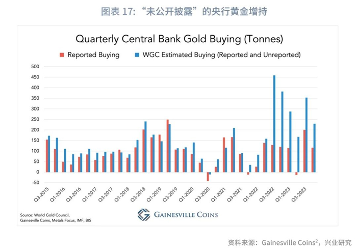 根据世界黄金协会(WGC)的估算,从2022年中期开始,未公开披露的央行黄金购买规模开始增加。2024年上半年全球央行购买了480吨黄金,其中只有30%左右公开披露,剩下70%都未公开披露。央行非公开地购入黄金可能降低大规模交易对金价波动的影响。