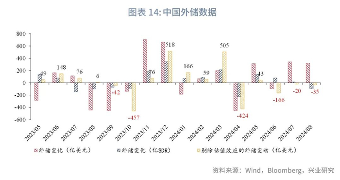 2024年8月,美元汇率、美债利率贡献正向估值,剔除估值效应后,外储实际减少35亿美元。