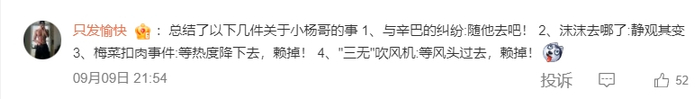 9月9日,知名打假博主王海,还发文称小杨哥曾带货售出超4.2万单、金额近400万元的某品牌原切牛肉卷为拼接牛肉卷,且该商家已被罚款50万,喊话小杨哥应按照假一赔十标准,赔付4200万给消费者。另外据查询,截止发稿,疯狂小杨哥社交账号粉丝数近一个月已掉粉超100万。
