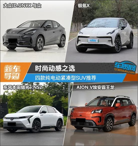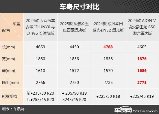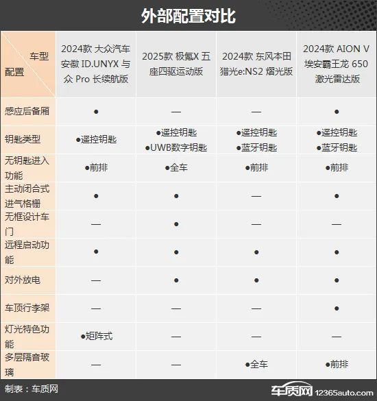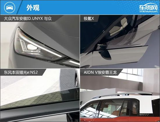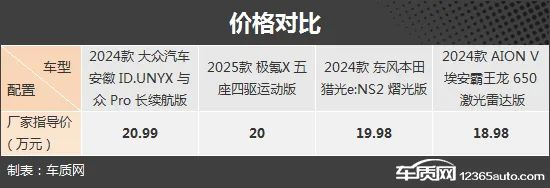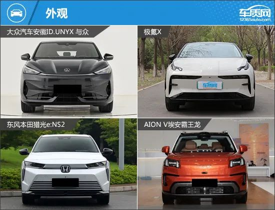 本次挑选的四款车型分别为2024款大众汽车安徽ID.UNYX 与众Pro长续航版(下文简称ID.UNYX 与众)、2025款极氪X五座四驱运动版(下文简称极氪X)、2024款东风本田猎光e:NS2 熠光版(下文简称猎光e:NS2)和2024款AION V埃安霸王龙650激光雷达版(下文简称埃安霸王龙)。我们挑选了价位尽可能接近的版本,售价控制在18-21万元之间。需要说明的是,由于2025款极氪X五座四驱运动版的图片缺失,所以用2024款极氪X车型图片替代,两者外观和内饰基本没有变化,仅对配置进行调整。