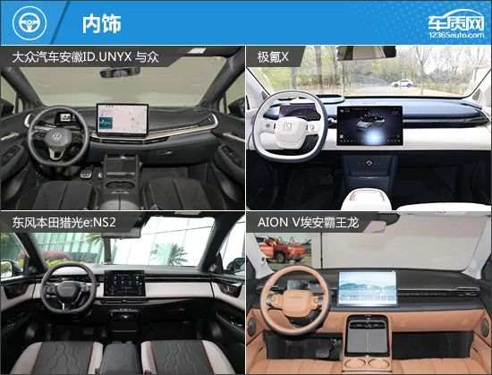 内饰方面,四款车的中控台都采用了贯穿式造型,并不约而同地配备了悬浮式中控屏。其中,ID.UNYX 与众、极氪X和埃安霸王龙均提供了悬浮式全液晶仪表,而猎光e:NS2为嵌入式设计,与空调出风口保持水平,视觉观感更加规整。此外,ID.UNYX 与众和埃安霸王龙的中央通道为一体式设计,而极氪X和猎光e:NS2为分体式造型,空间利用率更高一些。