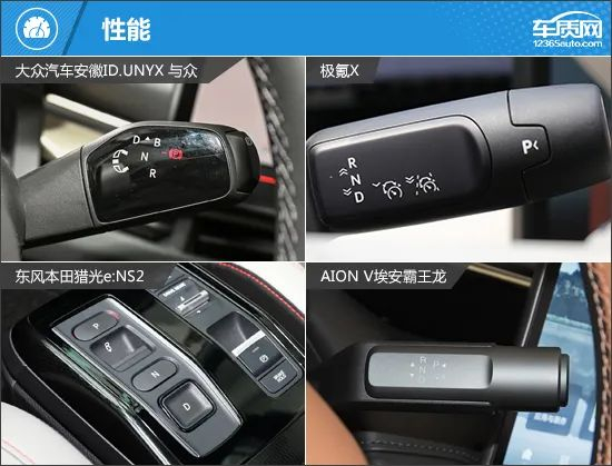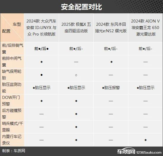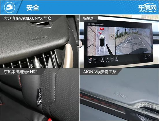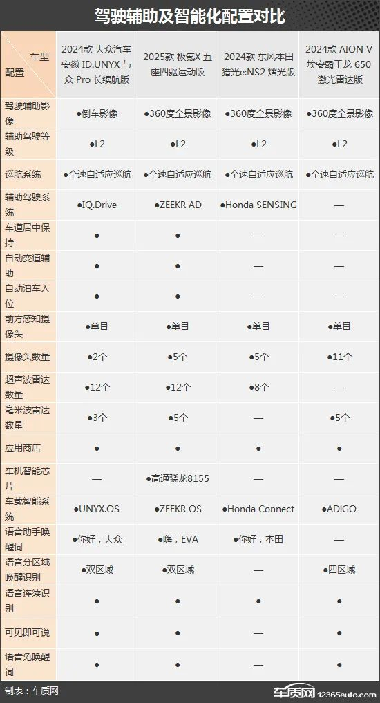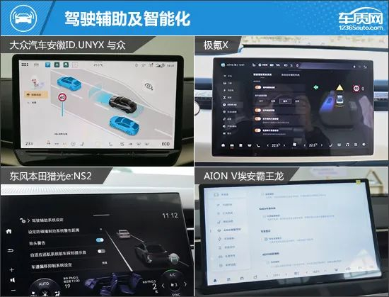 在驾驶辅助配置方面,ID.UNYX 与众和极氪X相对完善,特别是在传感器数量方面,明显领先于其他两款车型。相比之下,猎光e:NS2和埃安霸王龙的表现薄弱一些,尤其是缺失了车道居中保持功能,对于全速自适应巡航来说体验影响较大。