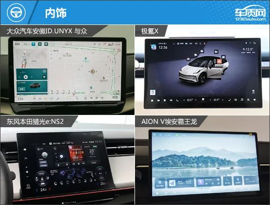 在外部配置方面,四款车型各有千秋。ID.UNYX 与众独享矩阵式前大灯,并提供了感应后备厢功能,但像对外放电和UWB数字/蓝牙钥匙等配置有所缺失。极氪X是四款车中唯一配备无框车门的车型,对于年轻消费者来说“杀伤力”不小。而猎光e:NS2则独享全车多层隔音玻璃,车内静谧性无疑会更好一些。反观埃安霸王龙,有着很强的常规SUV风格,其所配备的车顶行李架是其他三款车型所不具备的。