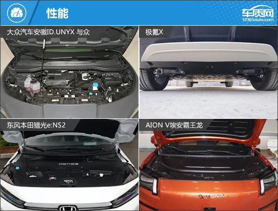 动力系统方面,极氪X是四款车中唯一搭载双电机的车型,从参数上来看,电动机总功率和总扭矩表现最为出色,不过由于电池容量较小,导致纯电续航是四款车型中最短的。其余三款车虽然均配备了单电机,但ID.UNYX 与众为后置单电机,因此操控表现会更好一些,并且还搭载了四款车中容量最大的82.4kWh电池组,但CLTC纯电续航里程反而不如埃安霸王龙的650km。