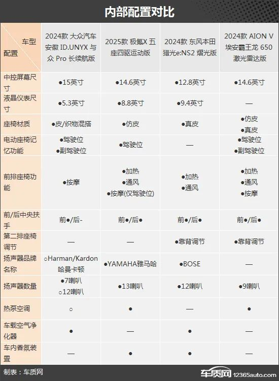 内部配置方面,四款车同样各具特色。ID.UNYX 与众提供了前排电动座椅记忆功能以及按摩功能,但未提供通风和加热,令人有些不解。极氪X则提供了前排座椅通风/加热、主驾驶位座椅记忆/按摩、车内香氛装置以及13扬声器的雅马哈音响系统,整体表现较为出色。猎光e:NS2同样提供了前排座椅加热/通风、车内香氛装置以及12扬声器的BOSE音响系统,但没有提供座椅记忆功能。埃安霸王龙则是前排座椅功能最全的车型,提供了加热/通风/按摩/记忆,但缺少了车载空气净化器和车内香氛装置,音响系统也不提供品牌音响选装。