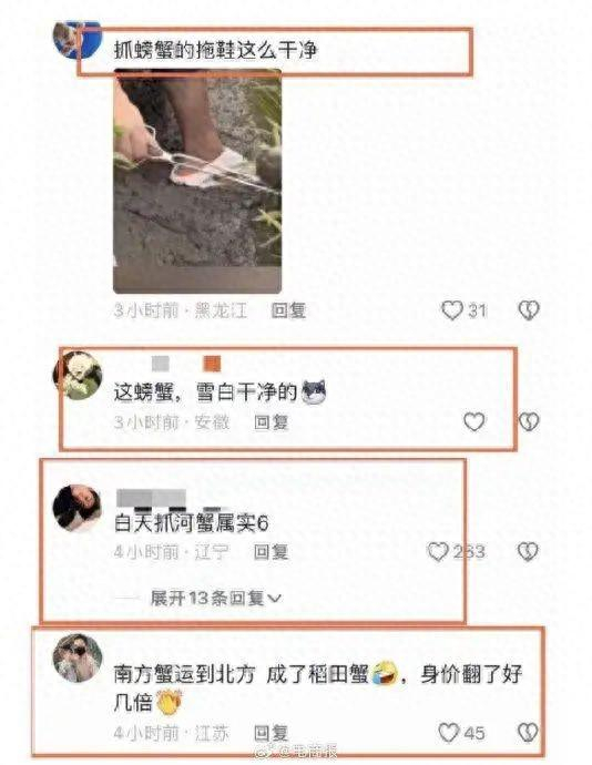 部分网友自称当地养殖稻田蟹村民,在其评论区晒出诸多细节证据,如 “正宗的盘锦稻田蟹没这么大”、“抓螃蟹都是晚上在岸边抓”、“盘锦稻田蟹很黑”等,证明东北雨姐所抓的稻田蟹是提前安排好的,存在摆拍造假问题。