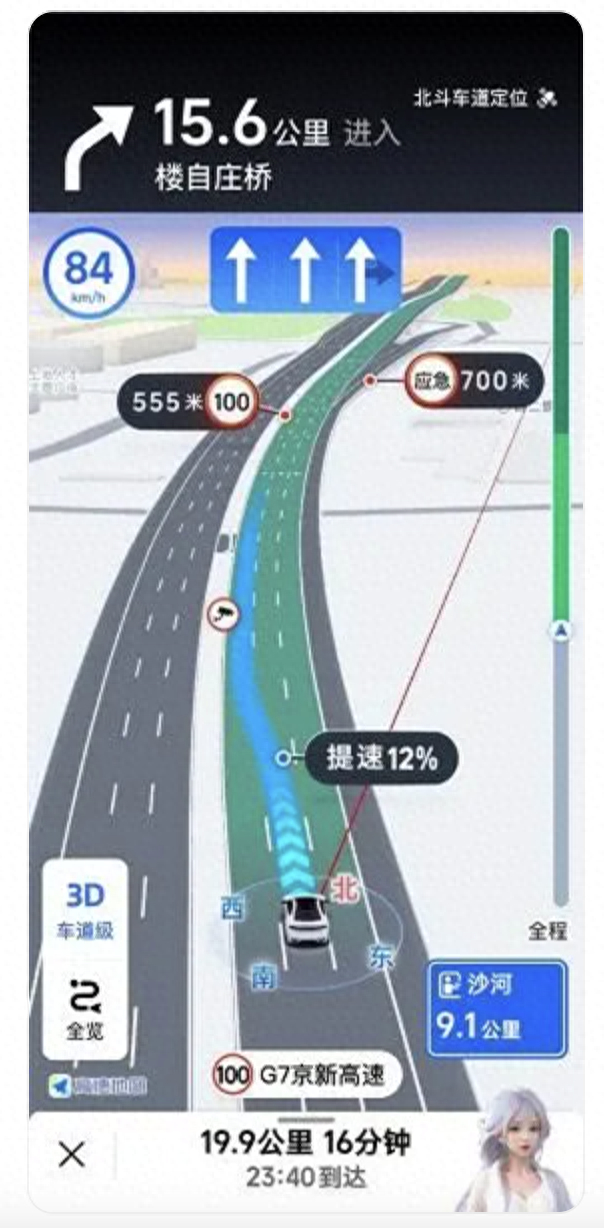 据高德地图该技术负责人介绍,此次车道级领航功能上线依赖于几项关键技术的进步。首先,车道级网络覆盖扩展至全国所有高速公路;其次,通过北斗系统的高精度定位技术,实现了亚米级的定位精度;此外,时空计算能力的提升使得高德能够实时还原任何地点的交通状况,并进行精确的路径规划。