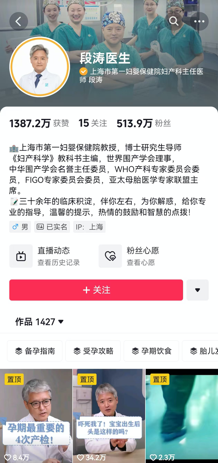 国家及各地卫健委、国内多家知名医院和专家也都在抖音持续发布权威医疗科普内容。包括国家呼吸医学中心、广州呼吸健康研究院院长何建行,广州医科大学第一附属医院副院长周承志均入驻了抖音。其中,上海市第一妇婴保健院妇产科主任医师段涛单个账号粉丝就突破了500万,视频累计播放量近27亿次,收获点赞近1500万次。